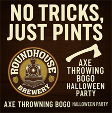 Don't have kids and looking for something SPOOKTACULAR to do for your Halloween? Head to Roundhouse for some AXE THROWING! We'll be doing BOGO on our Axe Throwing all night! Make a reservation by calling the taproom or emailing ashli@roundhousebrew.com