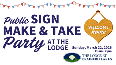 Get creative with us at The Lodge at Brainerd Lakes for a fun afternoon of sign making! Join us Sunday, March 22nd from 11 AM – 2 PM and design your own custom sign with help from our co-host Lakes Area Custom.