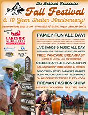 Join us as we celebrate a decade of rescue! Our 5th Annual Fall Festival, sponsored by Lakeside Simplicity, will take place on September 12th from 9:00 AM to 7:00 PM. In honor of our shelter’s 10th anniversary, this year’s event is bigger and better than ever. Check out the lineup below: