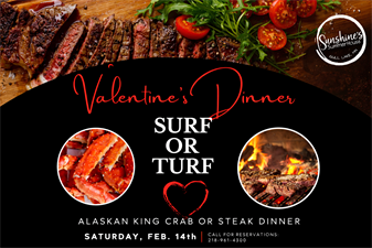 Join us for a special Surf or Turf Valentine’s Dinner, perfect for date night, anniversaries, or a cozy night out.
